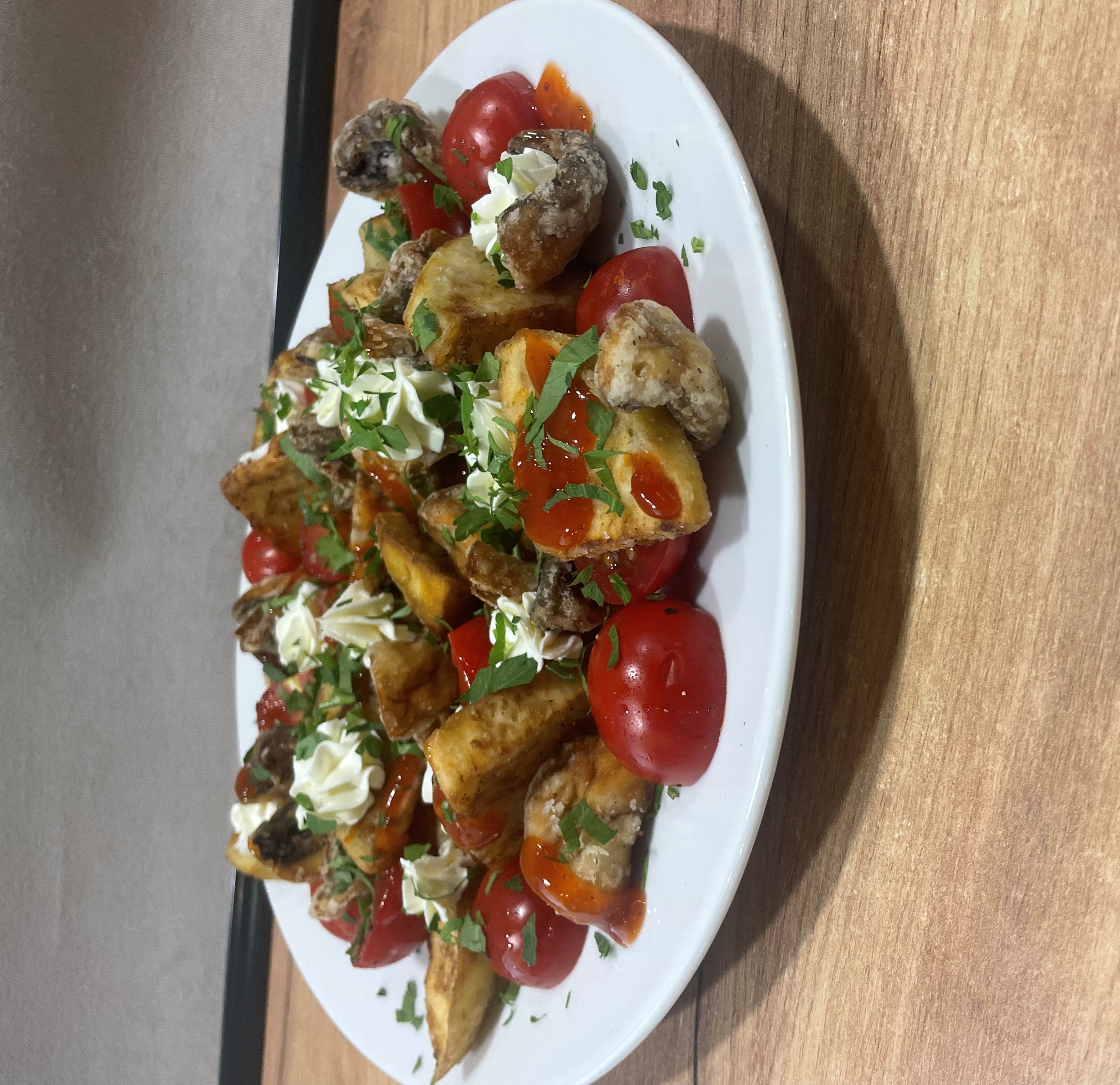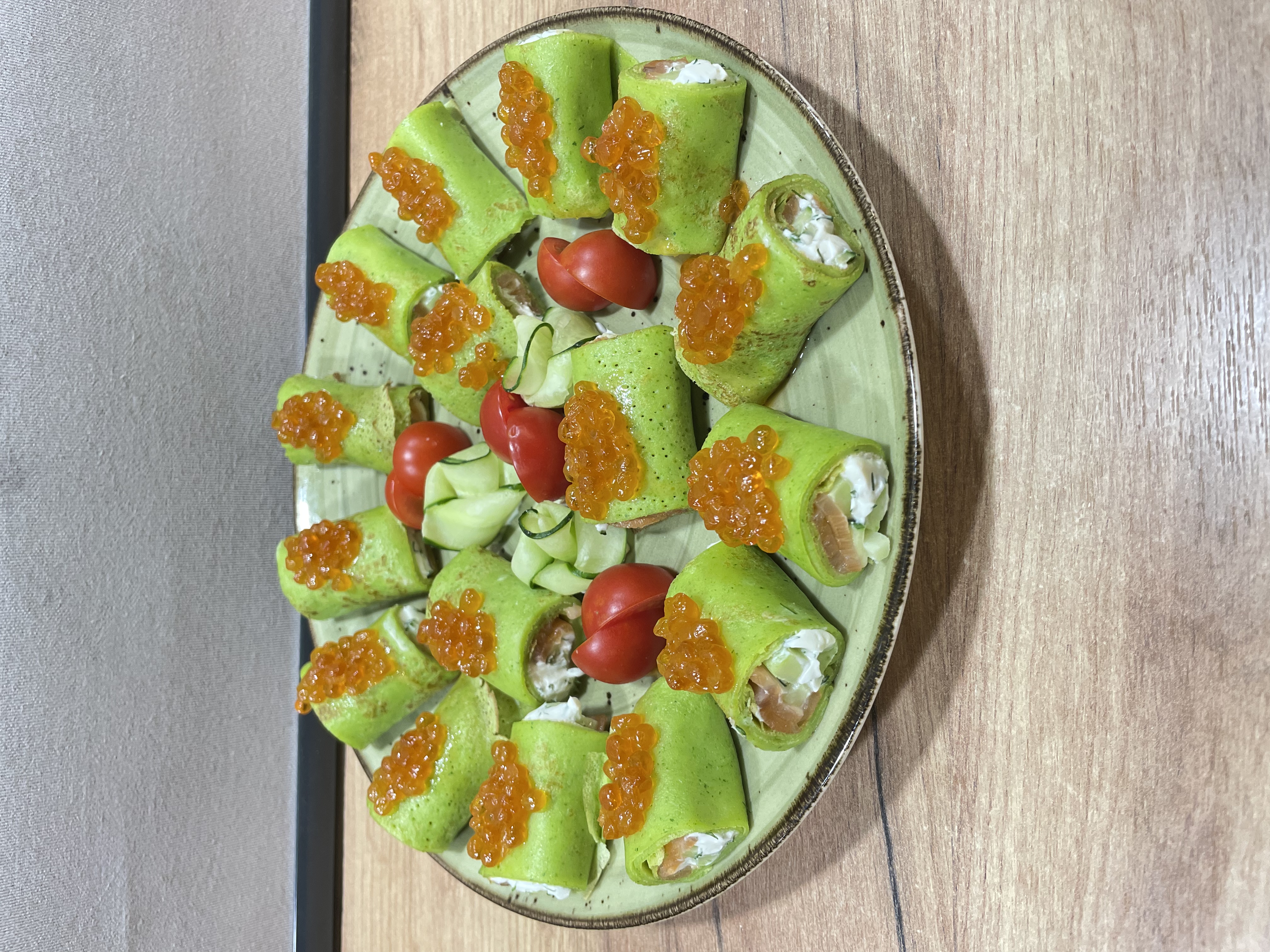 Баклажан,свіжі томати,крем сир,зелень,соус Sweet chilli